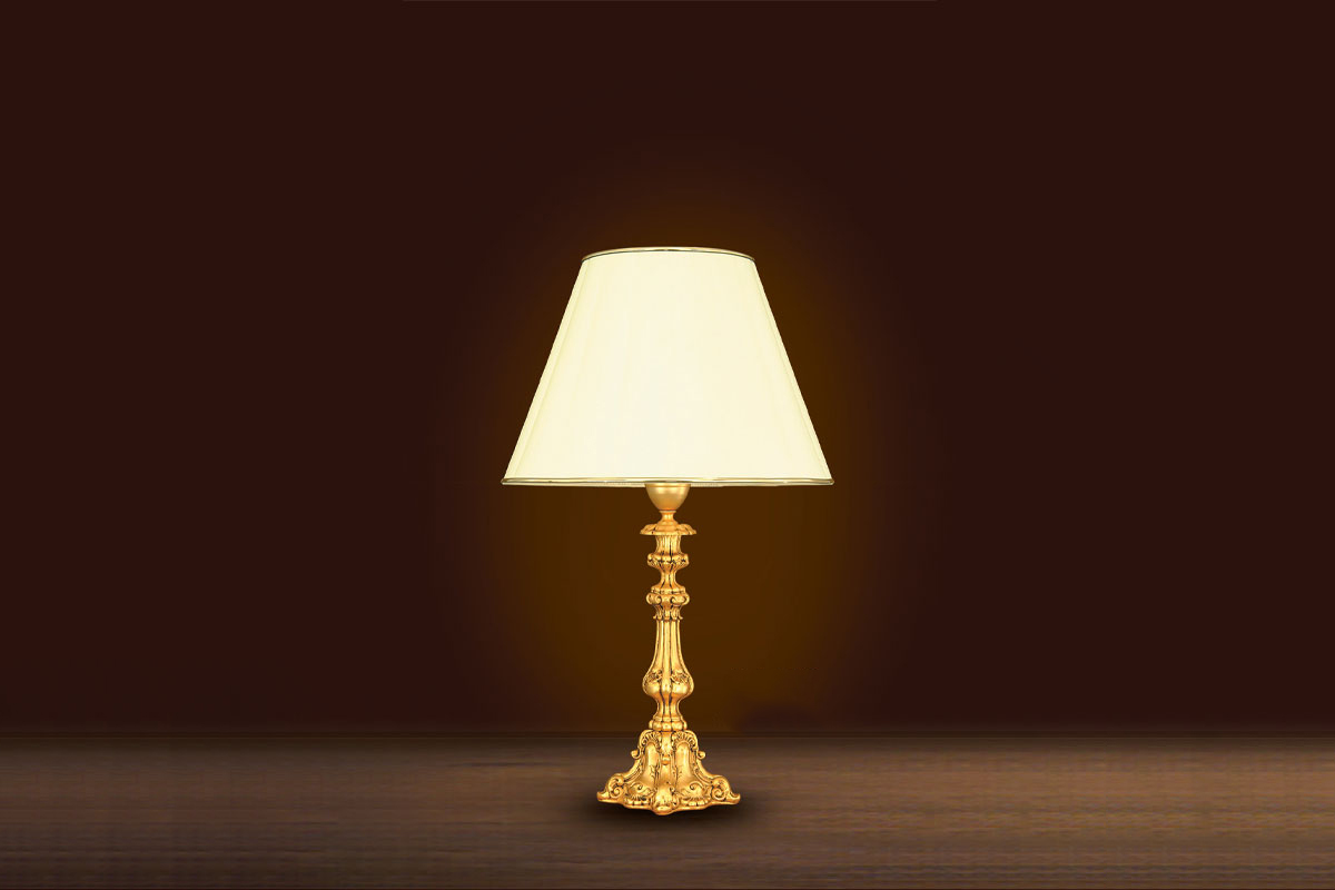 Phần chao đèn có hình dáng cổ điển, được làm từ vải cao cấp với màu sắc trung tính, hài hòa với thân đèn mạ vàng bên dưới. Tỷ lệ giữa chao đèn và thân đèn được tính toán cẩn thận để tạo nên một tổng thể cân đối, đẹp mắt. Khi được thắp sáng, ánh sáng dịu nhẹ tỏa ra từ chao đèn sẽ tạo nên một bầu không khí ấm áp, lãng mạn cho căn phòng.