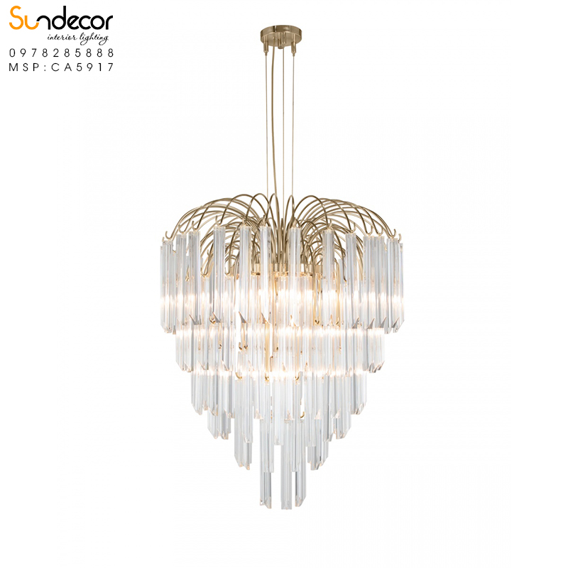 Đèn chùm CA5917 được chế tác từ những chất liệu cao cấp nhất trong ngành công nghiệp đèn trang trí. Phần khung của đèn được làm từ đồng và Brass, sau đó được mạ titan vàng 24K, tạo nên một lớp phủ vàng đồng sáng bóng, mang đến vẻ đẹp sang trọng và ấm áp cho toàn bộ thiết kế.