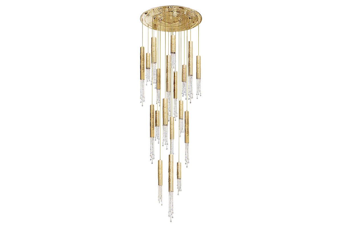 Safi Suspension không đơn thuần là một chiếc đèn chùm thông thường. Nó là hiện thân của một tác phẩm nghệ thuật ánh sáng, lấy cảm hứng từ vẻ đẹp thanh thoát của những chiếc chuông gió đung đưa. Thiết kế độc đáo với những ống trụ vàng óng được treo từ tấm đế tròn lớn, tạo nên một tổng thể hài hòa và uyển chuyển.