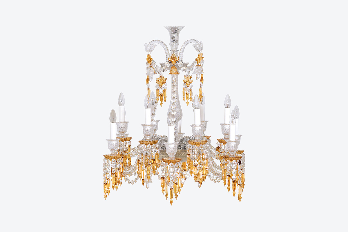 Mẫu đèn chùm pha lê Pháp này sở hữu thiết kế với 12 tay đèn uốn lượn mềm mại, tượng trưng cho sự hòa quyện giữa ánh sáng và nghệ thuật. Điểm nhấn đặc biệt của đèn nằm ở các tinh thể pha lê vàng champagne, được chế tác từ sự pha trộn hoàn hảo giữa uranium và vàng, tạo nên sắc màu lấp lánh, đầy cuốn hút. Sự phản chiếu ánh sáng qua các viên pha lê tinh khiết này mang đến hiệu ứng lung linh, làm bừng sáng không gian, tạo nên không khí xa hoa và tráng lệ.