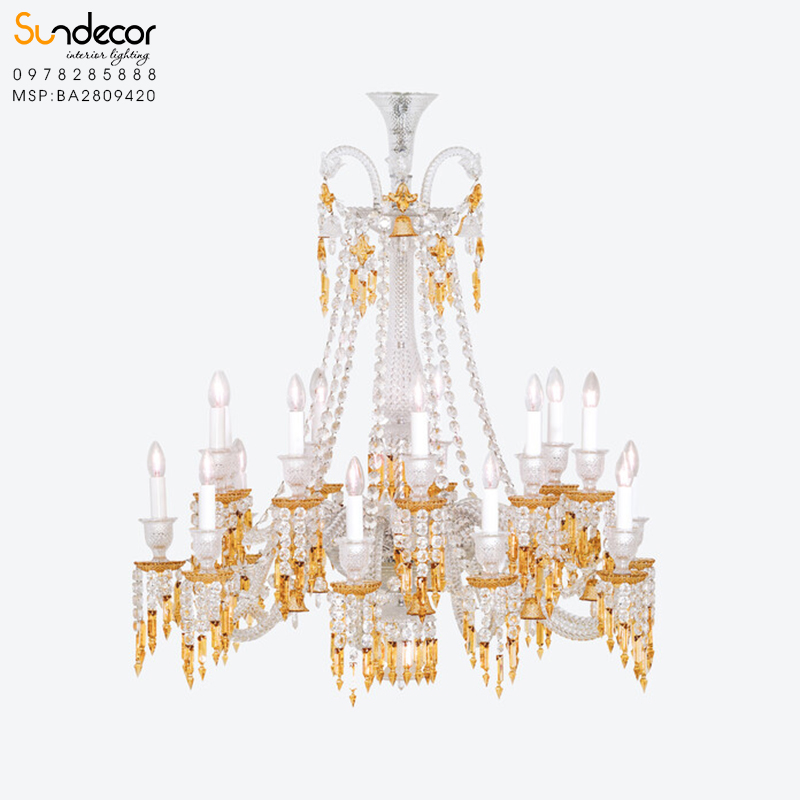 Đèn sở hữu thiết kế ấn tượng với 18 tay đèn được bố trí xung quanh trung tâm, tạo nên sự cân đối hoàn hảo cho ánh sáng lan tỏa đều khắp mọi hướng. Đặc biệt, sự kết hợp giữa pha lê vàng champagne và các chi tiết vàng tạo nên vẻ đẹp rực rỡ, đầy nhiệt huyết của tuổi 20.