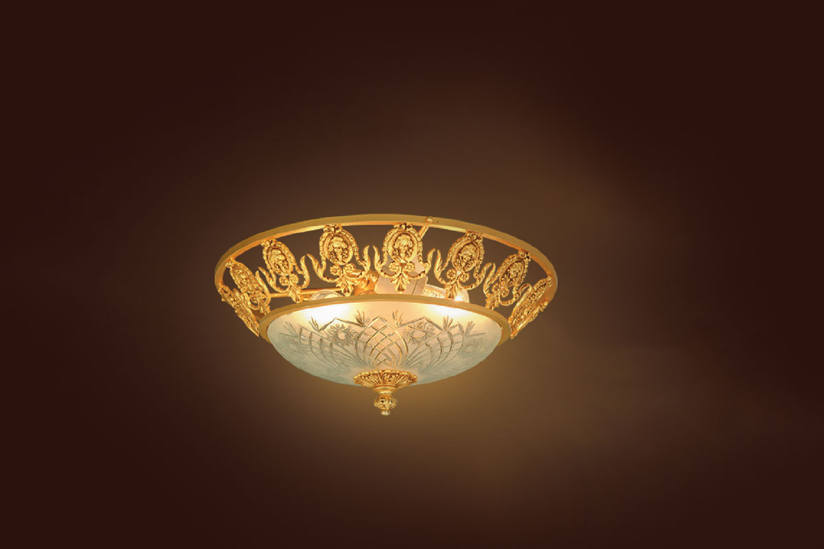 Sự kết hợp giữa đồng mạ vàng và pháp lam – chất liệu có nguồn gốc từ nghệ thuật chế tác truyền thống – tạo nên một đèn ốp trần không chỉ đẹp mắt mà còn mang giá trị nghệ thuật cao. Pháp lam với độ bóng mịn hoàn hảo kết hợp cùng các chi tiết cầu kỳ từ đồng mạ vàng tạo nên tổng thể hài hòa, vừa tinh xảo, vừa nổi bật.