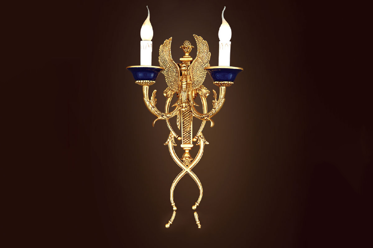 Mẫu đèn tường này được thiết kế với hình ảnh hai ngọn nến trắng, đặt dưới đui đèn mang hình dạng chiếc cốc làm từ chất liệu pháp lam, một chi tiết độc đáo làm nổi bật vẻ đẹp cổ điển của chiếc đèn. Phần thân đèn mô phỏng đôi cánh đại bàng được làm từ chất liệu đồng mạ vàng, tạo nên vẻ sáng bóng và bền bỉ, mang lại cảm giác quý phái cho mọi không gian.